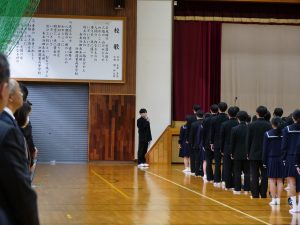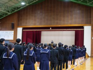 校長先生は「2026年、新しい年を迎えました。6日には、大きな地震がありましたが、こうして皆さんの元気な姿を見ることができて嬉しく思います。1月は、大切な検定試験が控えています。資格を取得することで、自分の可能性が広がります。試験勉強は大変かもしれませんが、努力し続けることは、必ず自分にとってプラスになります。未来に繋がる努力をしっかりと積み重ねていきましょう。マハトマ・ガンディは、「未来は、今日何をするかによって決まる」という言葉を残しています。今の努力が、皆さんの未来を作ります。どうぞ有意義な3学期にしてください。」と新学期のあいさつをされました。