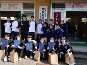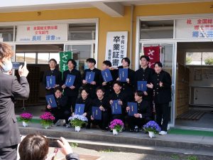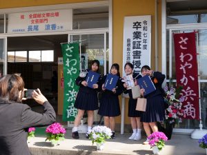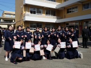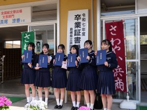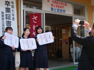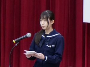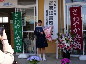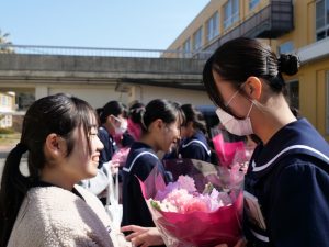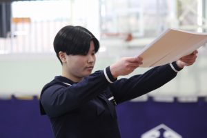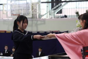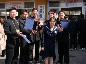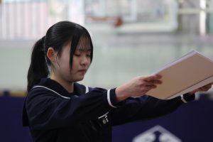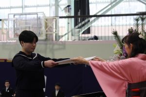 生徒会長の打田さんは「私たち75名は今日、それぞれの夢や不安を胸に、この学び舎を巣立ちます。楽しいことばかりではなかった高校生活。思うようにいかず悩み、立ち止まった日もありました。それでも、私たちのそばにはいつも仲間がいて、支えてくれる先生方がいて、見守ってくれる家族がいました。この学校で学んだこと、そして出会った人とのつながりは、きっと私たちの力になります。不安なとき、迷ったときには、この浜商で、過ごした日々を思い出し、前を向いて進んでいきたいと思います。そして学んだことを糧に、失敗を恐れず挑戦を続けながら自分自身を高め、自ら考え行動できる社会人として努力をしていきたいと思います。最後になりますが、私たち卒業生一同、これまで支えてくださったすべての方々への感謝を胸に、自分を信じ、仲間を信じそれぞれの道を歩んでいくことを、ここに誓います。」と涙ぐみながら答辞を述べました。